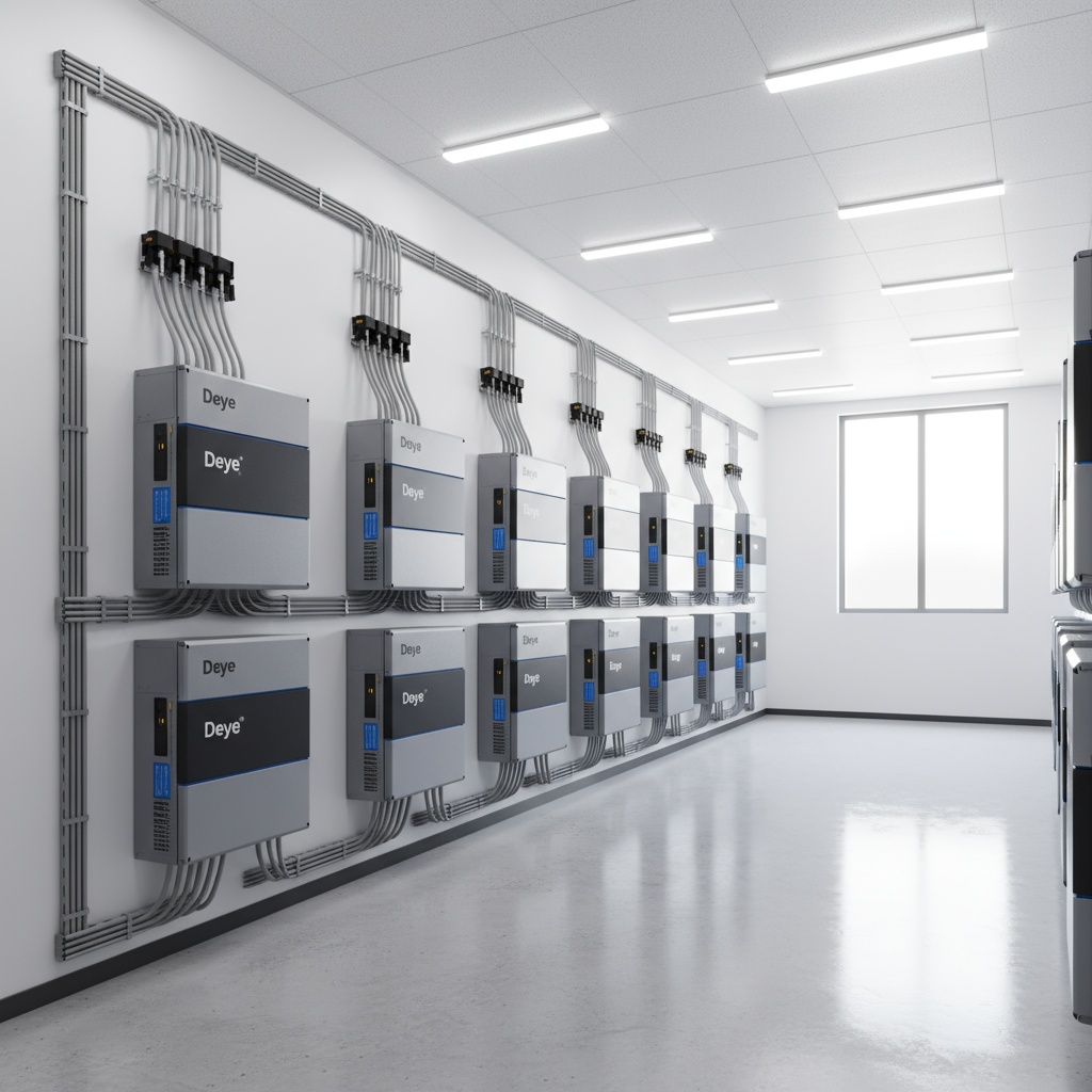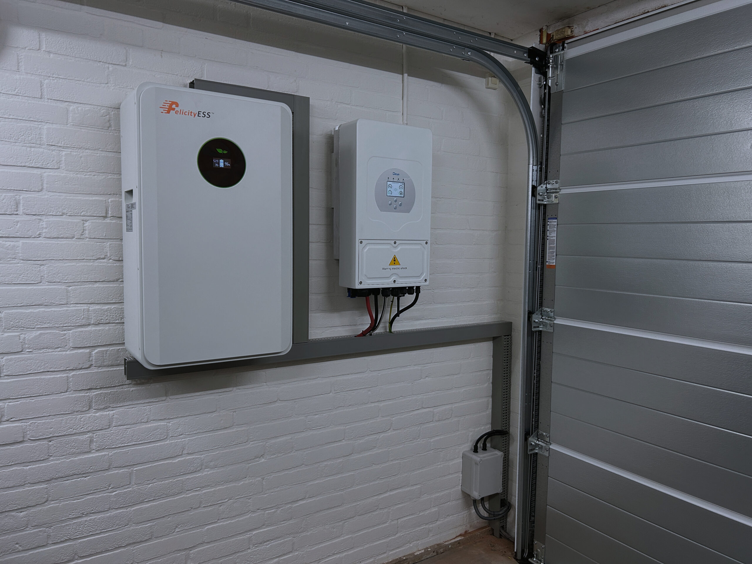 Volledige levering, montage en inbedrijfstelling van Deye hybride omvormers en LiFePO₄-accu’s.
